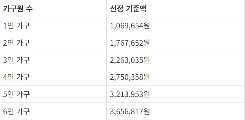 가구원 수에 따라 선정 기준액이 다르며, 이는 1인 가구부터 6인 가구까지 다양합니다.