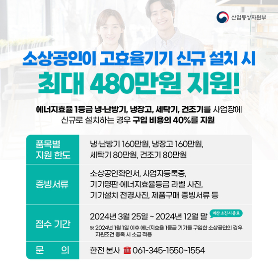 - 기타 : 2024년 1월 1일 이후에 에너지 효율 1등급 기기를 구입한 경우 소급 적용 가능 신청방법 : 공고문 상의 증빙서류(소상공인확인서, 사업자등록증, 기기명판‧에너지효율등급 라벨 사진, 기기설치 전경 사진, 구매증빙 등)를 구비한 후 3월 25일부터 한전 소상공인 고효율기기 지원사업 홈페이지를 통해 신청이 가능